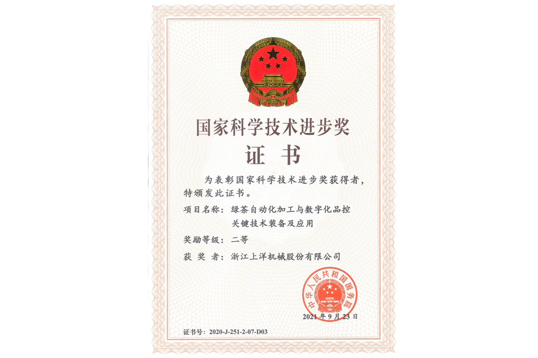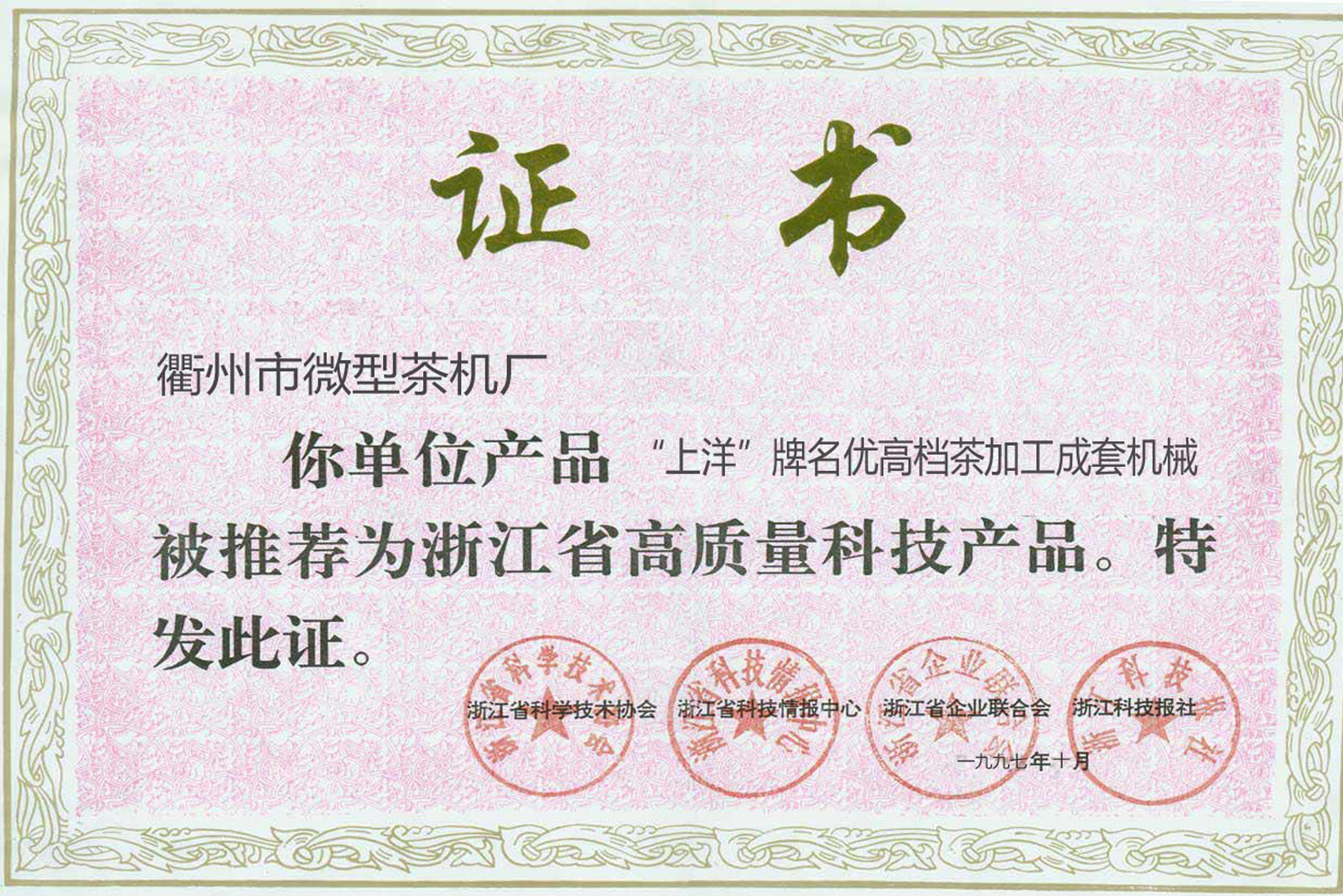 1991年(nian),微(wei)型(xing)成(cheng)套(tao)名(ming)優(you)茶(cha)加(jia)工(gong)機(ji)械(xie)通(tong)過(guo)省(sheng)級(ji)新(xin)產(chan)品(pin)鑒(jian)定(ding),這(zhe)是(shi)國(guo)內(nei)最(zui)早(zao)通(tong)過(guo)省(sheng)級(ji)鑒(jian)定(ding)的(de)茶(cha)機(ji)產(chan)品(pin),同(tong)年(nian)該(gai)產(chan)品(pin)分(fen)別(bie)榮(rong)獲(huo)浙(zhe)江(jiang)省(sheng)科(ke)技(ji)進(jin)步(bu)三(san)等(deng)獎(jiang)。