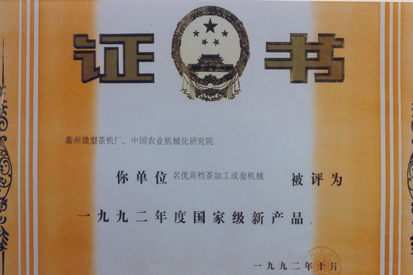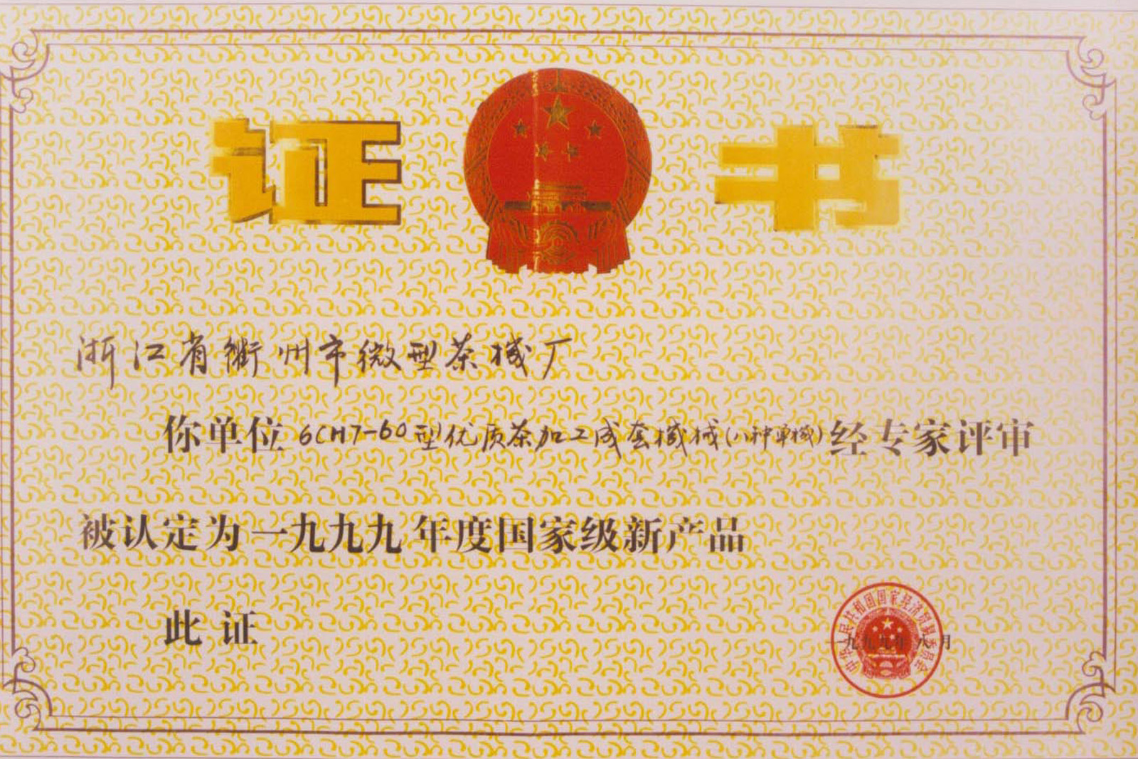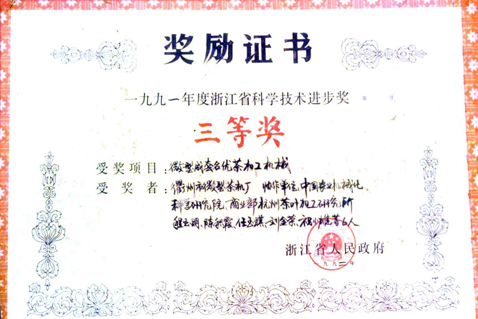 1991年(nian),微(wei)型(xing)成(cheng)套(tao)名(ming)優(you)茶(cha)加(jia)工(gong)機(ji)械(xie)通(tong)過(guo)省(sheng)級(ji)新(xin)產(chan)品(pin)鑒(jian)定(ding),這(zhe)是(shi)國(guo)內(nei)最(zui)早(zao)通(tong)過(guo)省(sheng)級(ji)鑒(jian)定(ding)的(de)茶(cha)機(ji)產(chan)品(pin),同(tong)年(nian)該(gai)產(chan)品(pin)分(fen)別(bie)榮(rong)獲(huo)浙(zhe)江(jiang)省(sheng)科(ke)技(ji)進(jin)步(bu)三(san)等(deng)獎(jiang)。